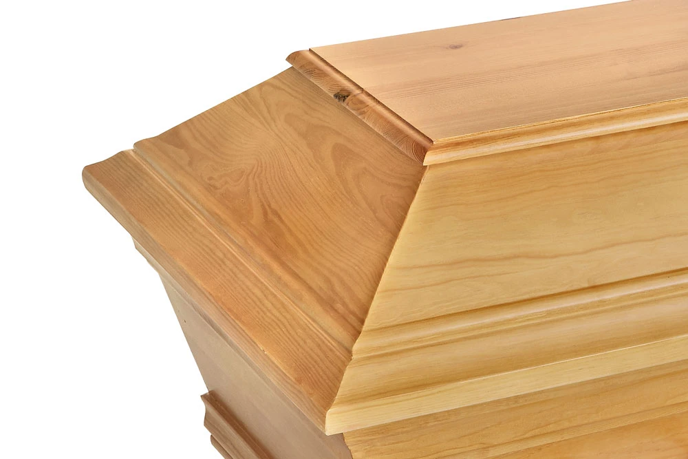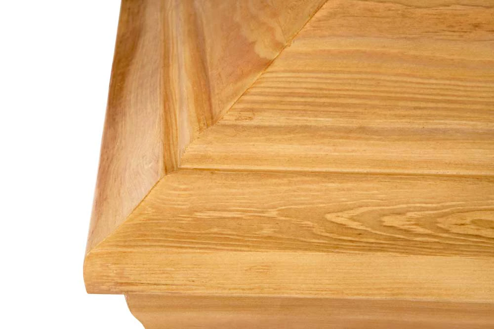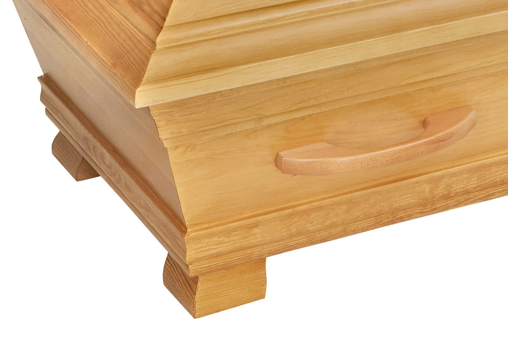 Alvö Ekbets är en klassiskt formgiven begravningskista tillverkad i massiv furu med få kvistar. Den är behandlad med en ljus ekbets som framhäver träets naturliga ådring och ger ett varmt, jordnära uttryck. Kistan har vackra urfrästa profileringar i både lock och botten, vilket förstärker dess eleganta och tidlösa karaktär.