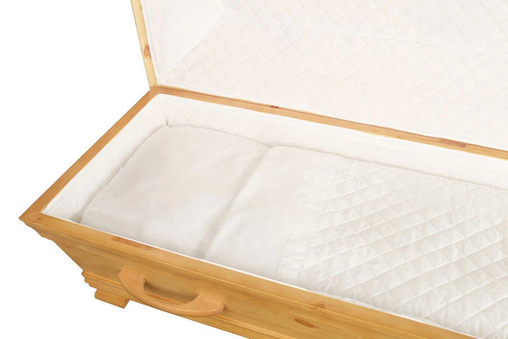 Insidan är omsorgsfullt klädd med vitt bomullstyg i både lock och bottendel. Bäddningen består av kudde, täcke med överlakansflik och lakan i mjukt bomullstyg. Kistan levereras med svepdräkt i bomull. Locket är monterat med dold skruvning för ett rent och diskret utseende.