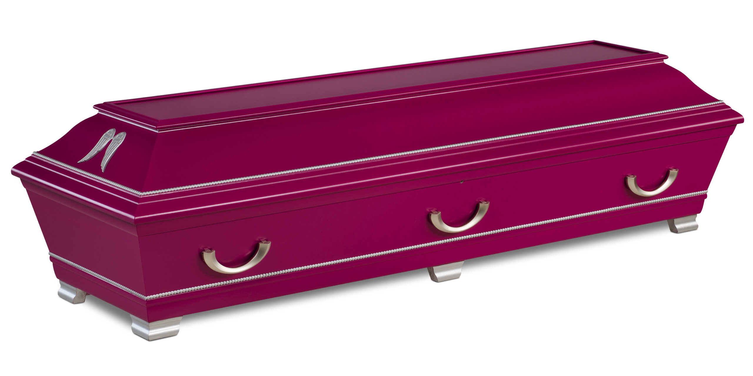 Angelbox Cerise är en elegant och personlig begravningskista med en varm och hoppfull rosa ton. Den är vitlackad med cerise färgsättning och har löstagbara änglavingar i silverfärg samt dekorativa detaljer på lock och botten. Kistan är ett uttrycksfullt val för ett ljust och kärleksfullt avsked.