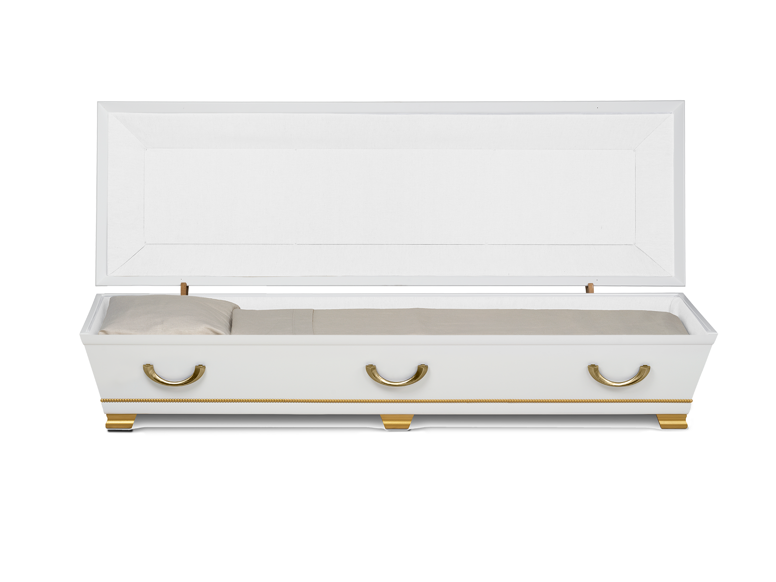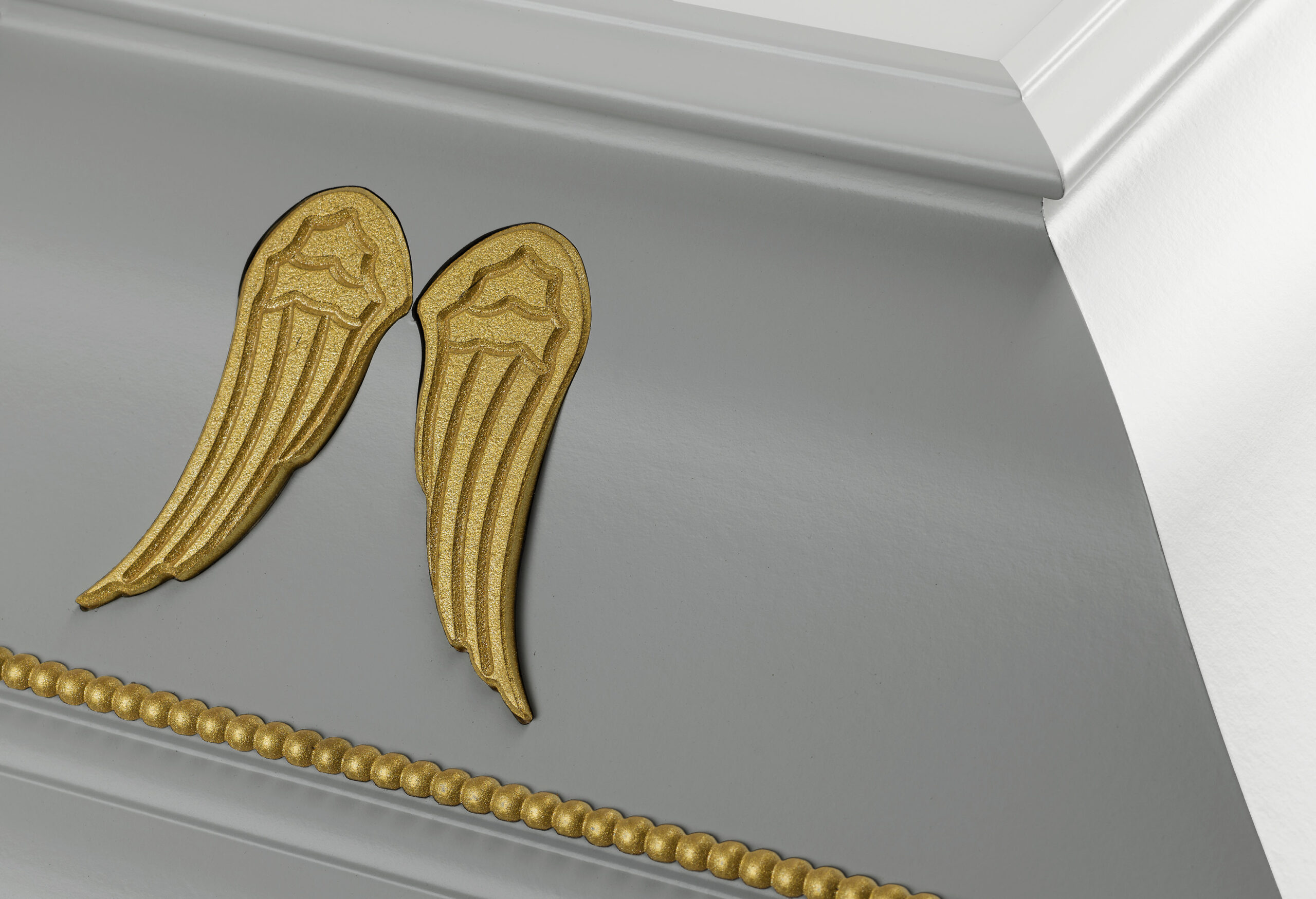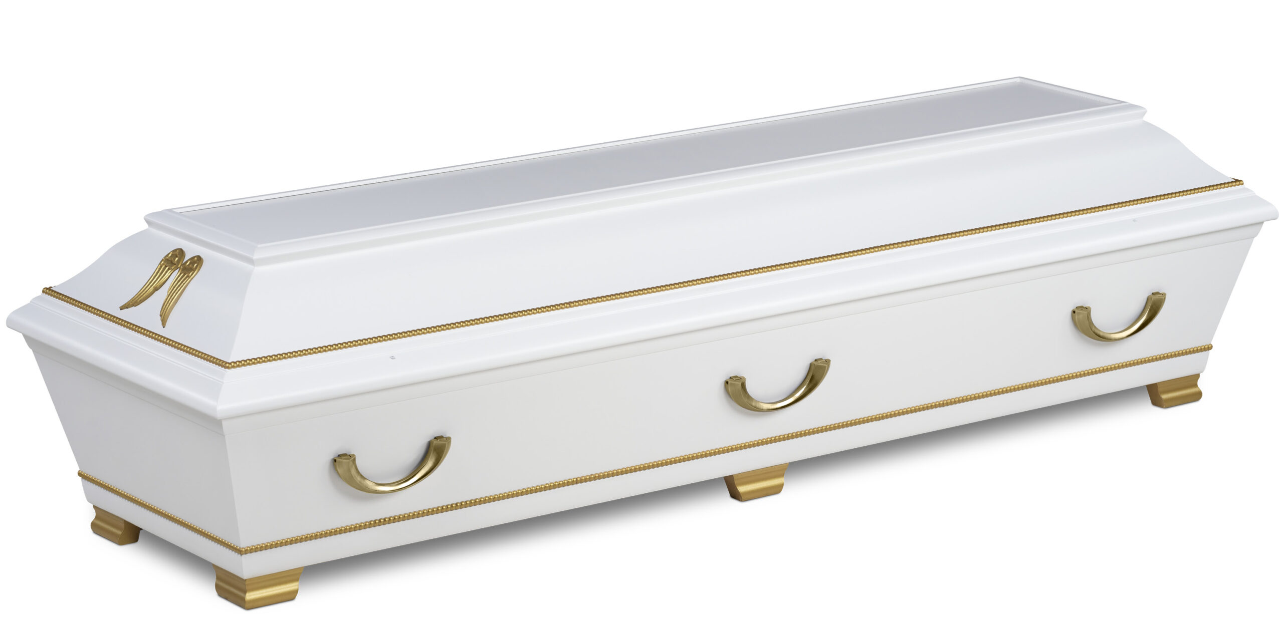 Angelbox Vit är en elegant och högtidlig begravningskista med en unik design som förmedlar stillhet, värdighet och omtanke. Den vitlackade ytan kombineras med guldfärgade änglavingar och dekorativa gulddetaljer på lock och botten, vilket gör kistan till ett symboliskt och minnesvärt val.