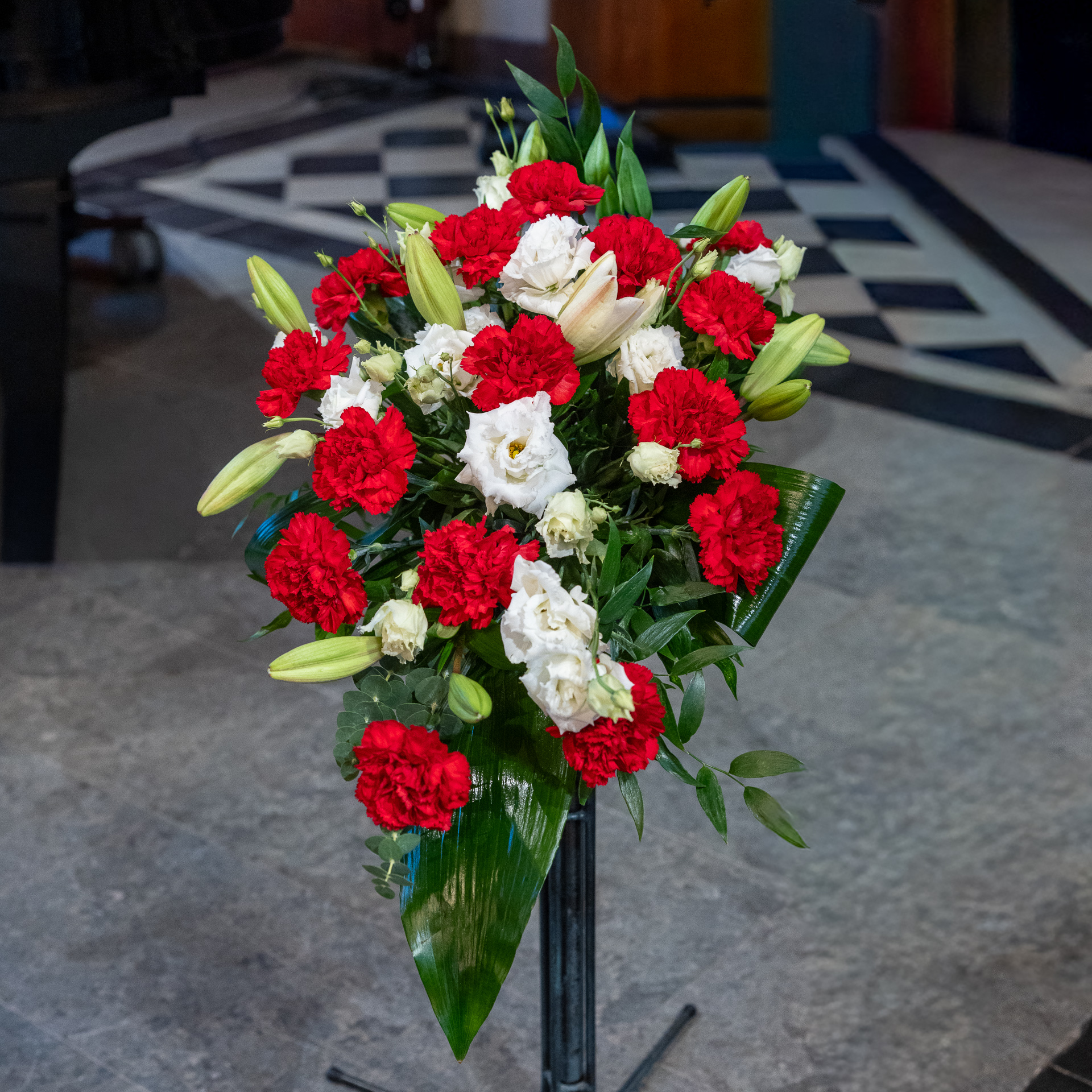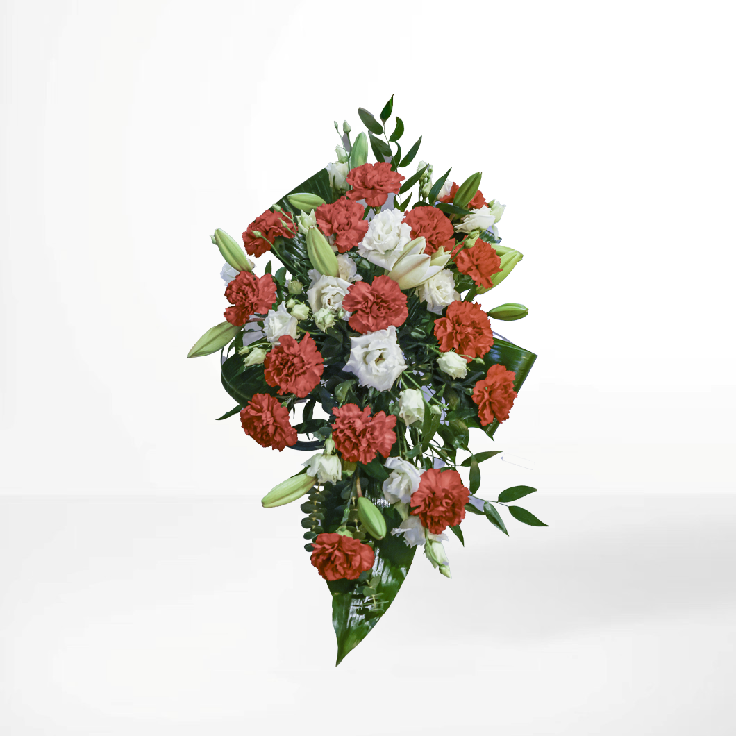 En elegant dekoration med röda nejlikor och vita liljor, kompletterad med gröna blad. Färgkombinationen symboliserar kärlek, styrka och frid – ett vackert sätt att hedra minnet av en nära person. Astrid är ett tidlöst val för begravning eller minnesstund.