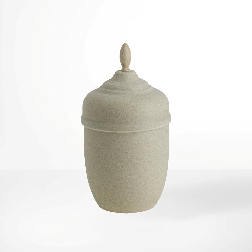 Urna av pressad, genomfärgad bark. Förgängligt material. Levereras med fackla som toppdekor. Sänkband ingår ej.