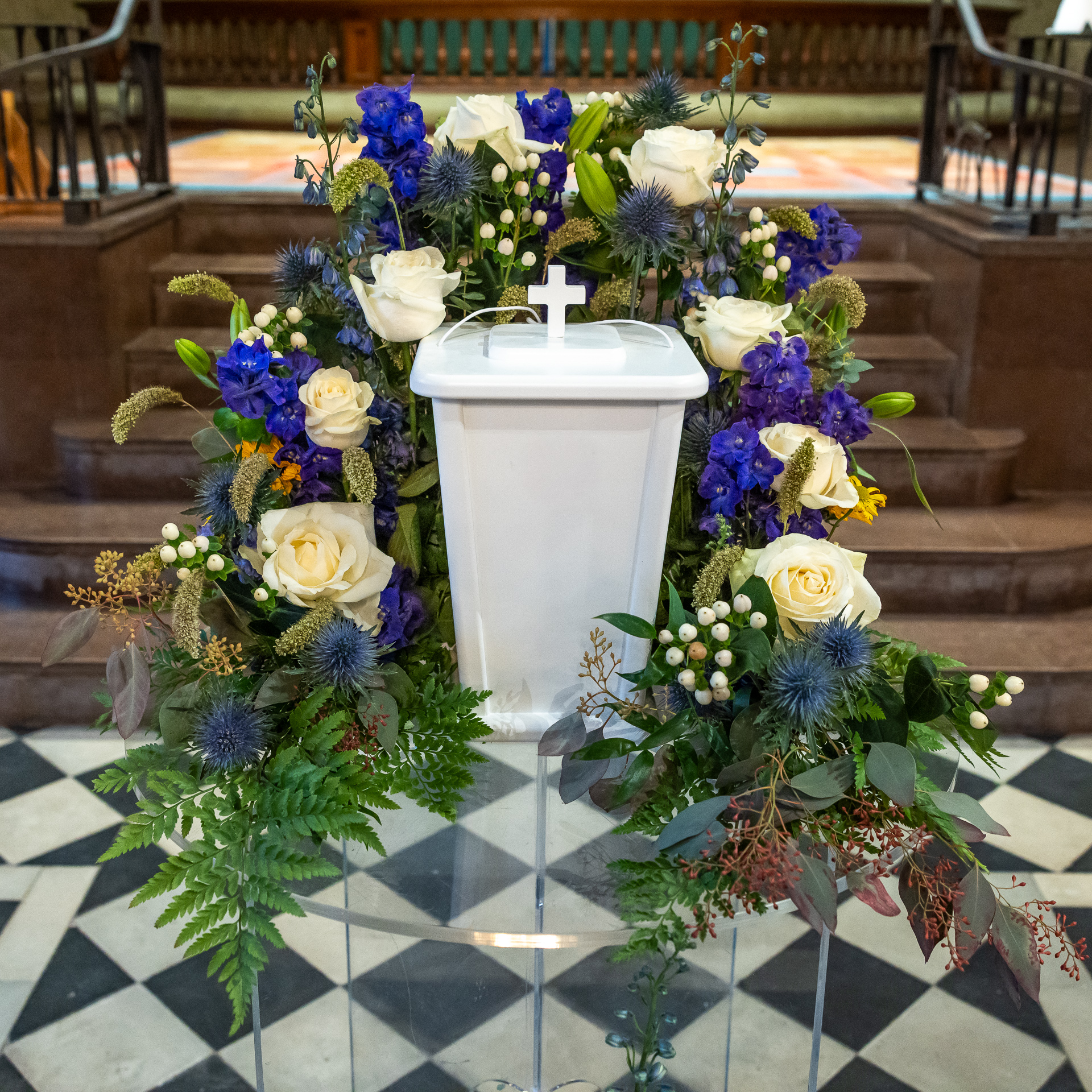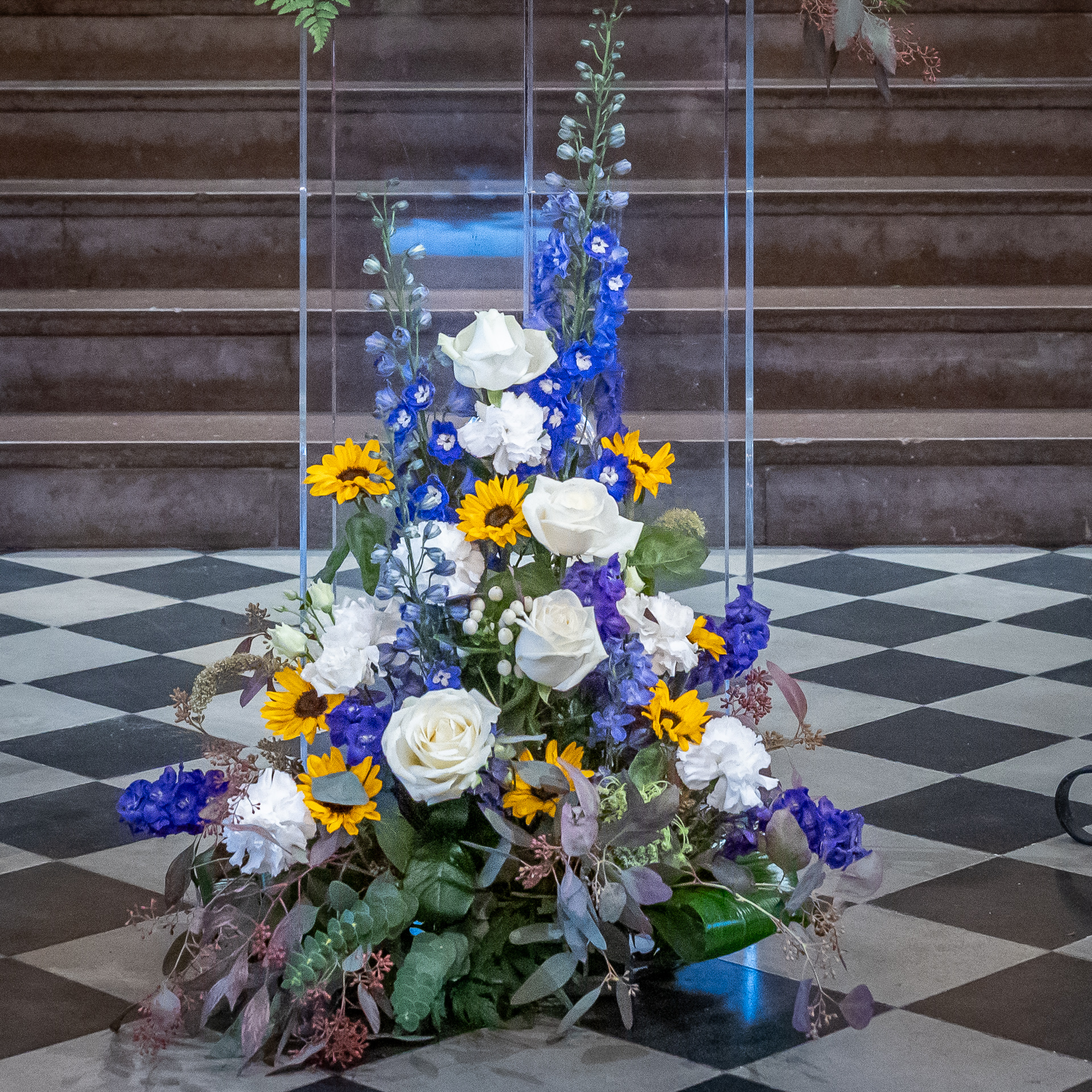 Vita rosor, blå riddarsporre, gula solrosor och vita bär.