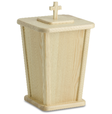 Urna med klassisk form tillverkad av svenskt trä i vår fabrik. Finns i oljad ek, lackad björk, obehandlad furu och vitmålad. Förgängligt material. Välj mellan kors eller knopp.