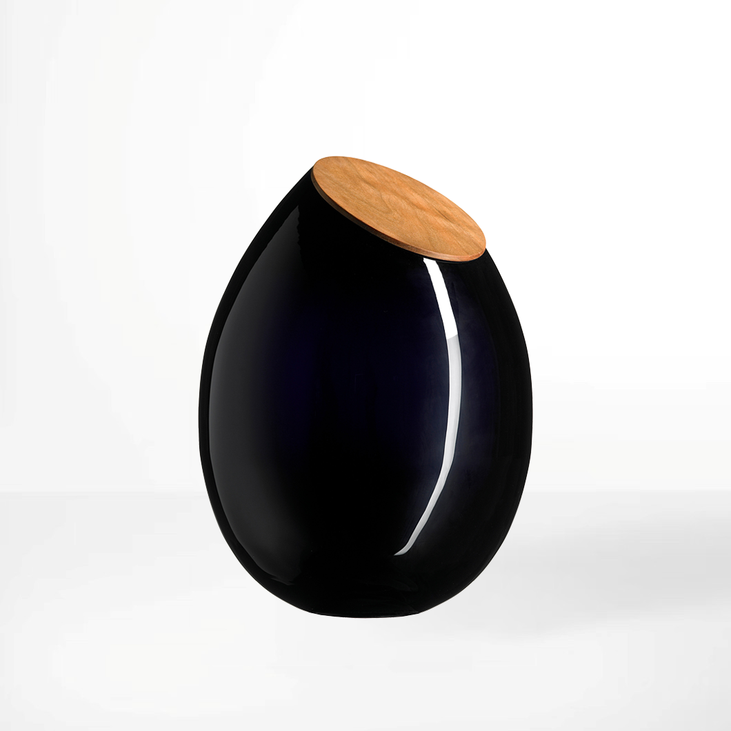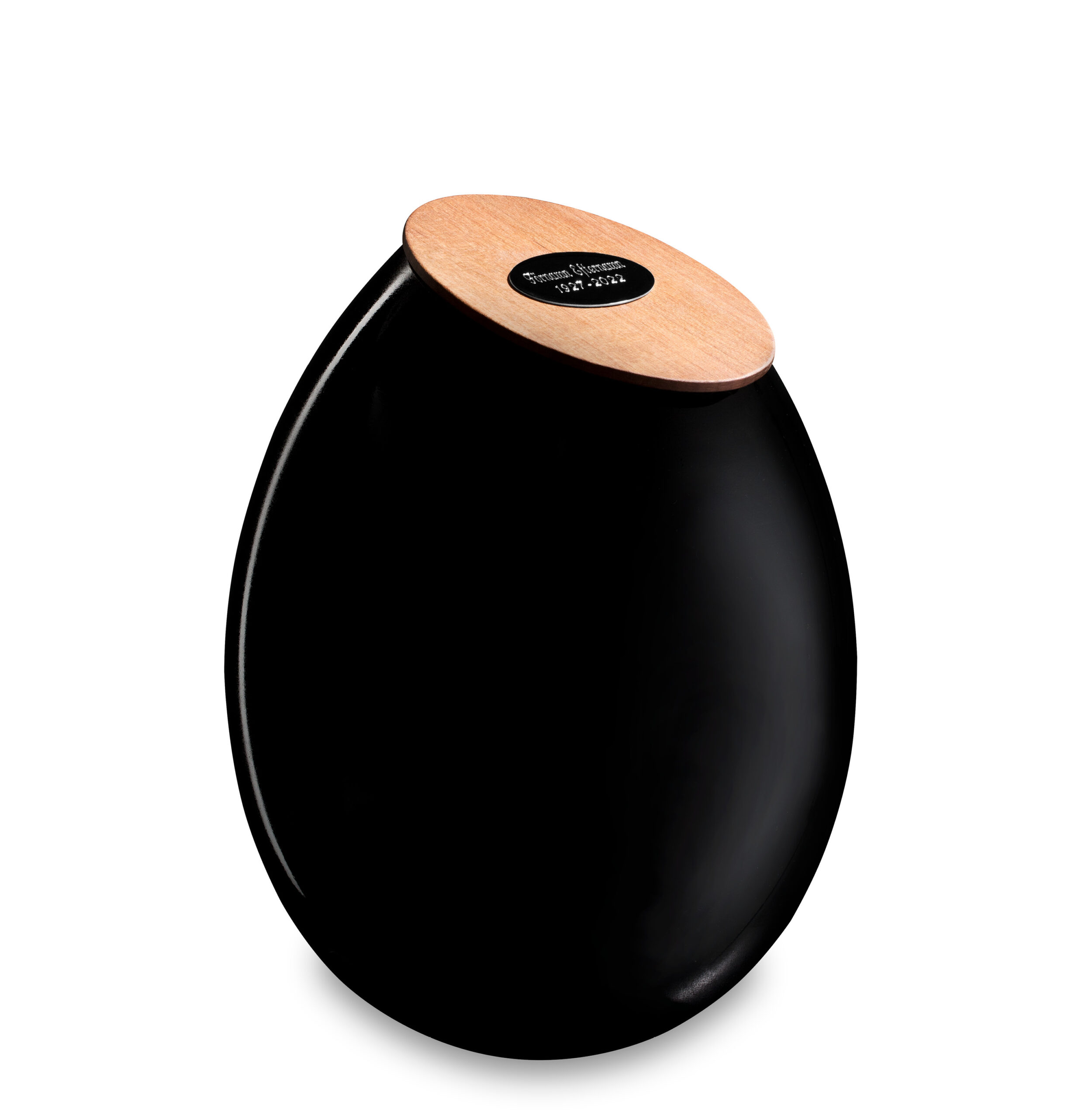 Urnan har ett elegant formspråk med en djup svart glasyta och ett lock i äkta körsbärsträ. Kombinationen av glas och trä skapar en harmonisk kontrast mellan material och uttryck. Eftersom varje urna är handgjord kan små variationer i form och färg förekomma – en påminnelse om det unika i varje människas liv.