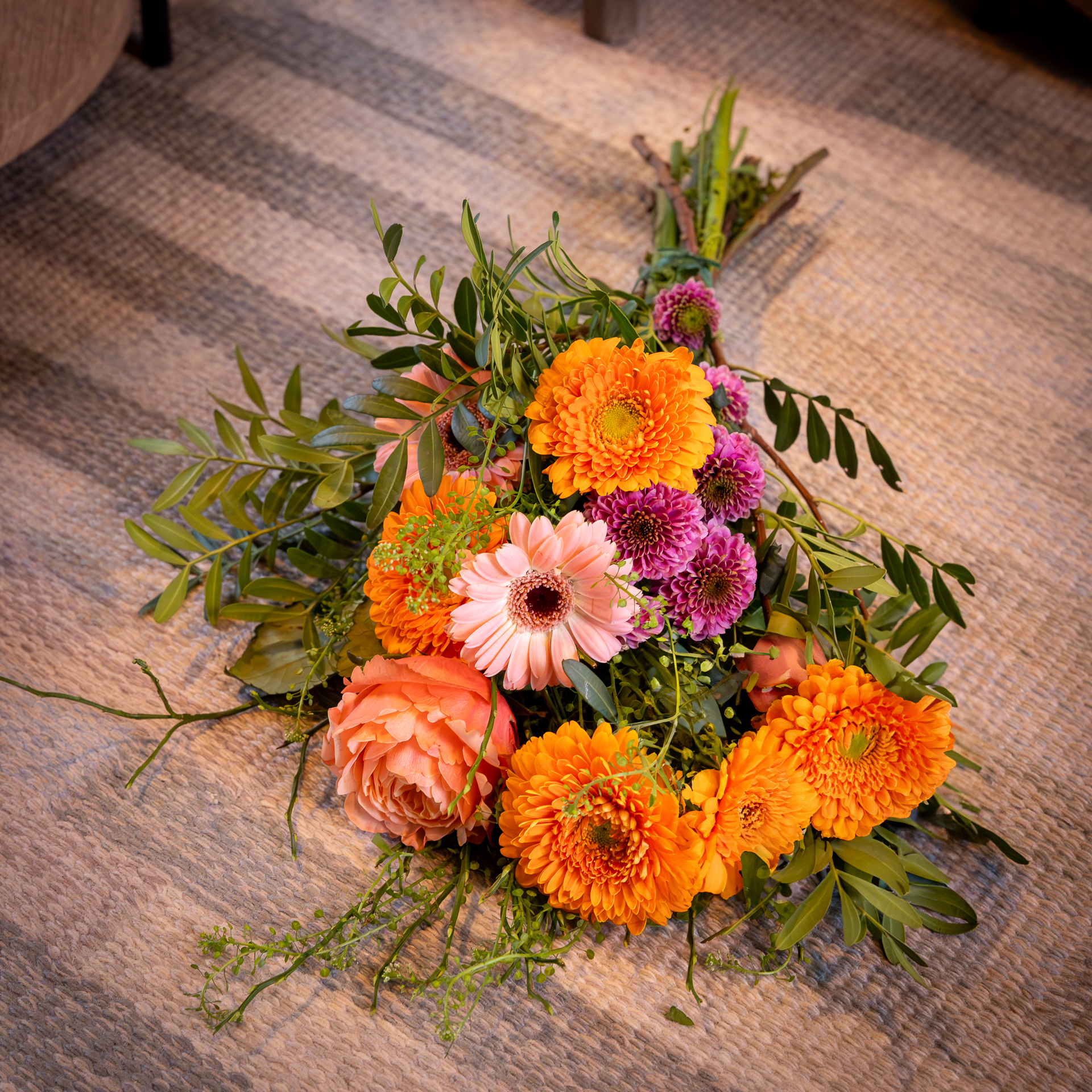 Hillevi är en färgstark och personlig handbukett som förmedlar värme, omtanke och livsglädje. Buketten binds med orange dahlior, rosa germini, lila krysantemum, persikofärgad ros och säsongens gröna bladverk. Den passar utmärkt att lägga vid kistan, urnan eller minnesplatsen som en sista hälsning från en närstående.