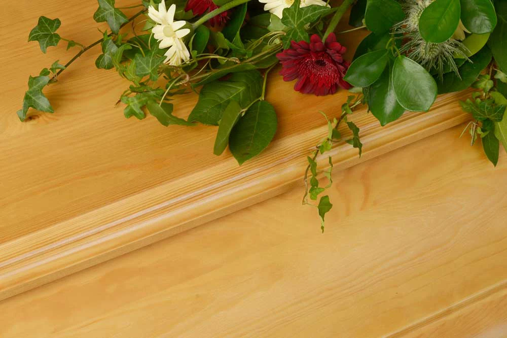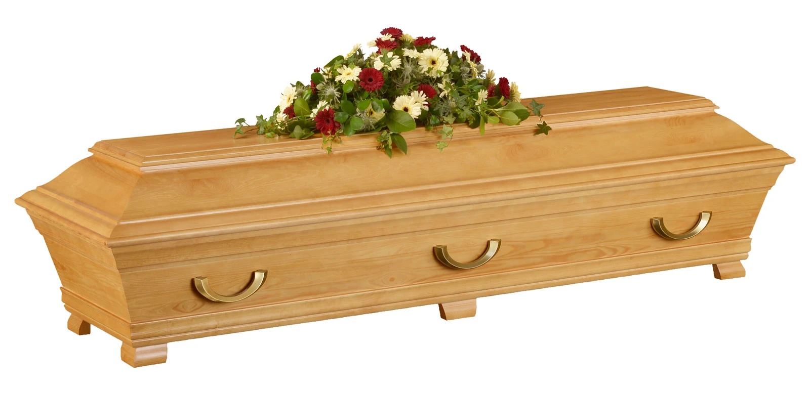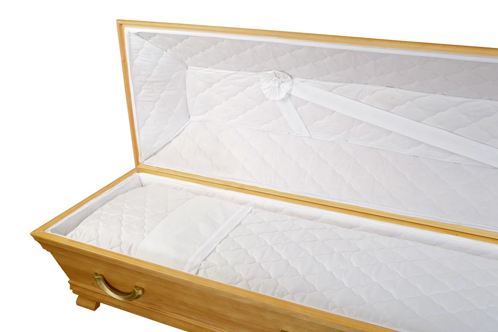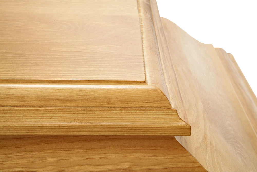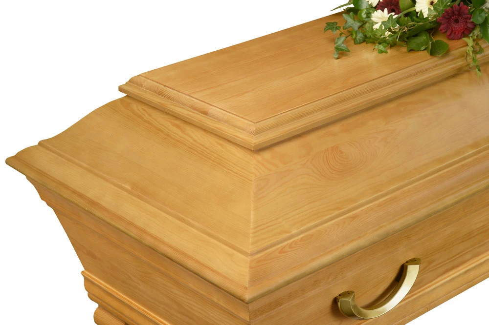 Den ljusa ekbetsen framhäver träets naturliga ådring och kistans form, där varje del är utformad med noggrann omsorg för att skapa en känsla av värdighet och respekt.