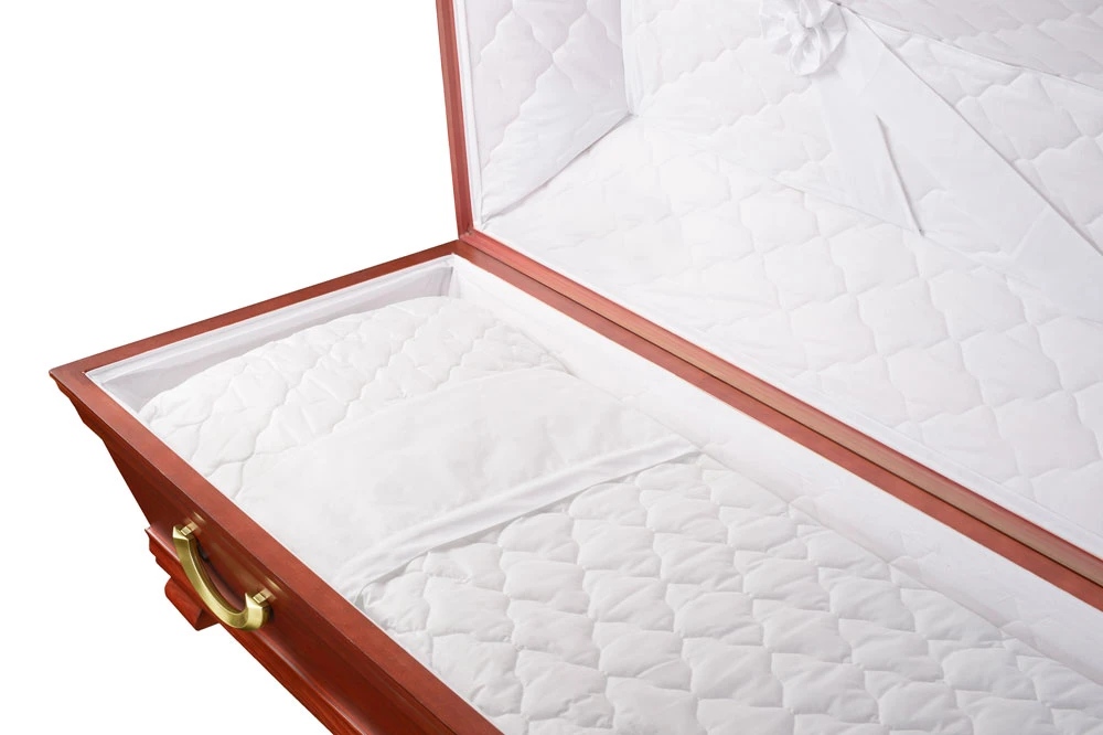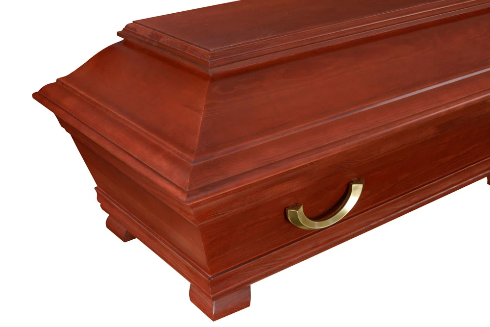 Kistan är betsad i en varm rödbrun ton som framhäver träets naturliga ådring och som tillsammans med handtagen i metall, ger kistan ett elegant, sofistikerat och exotiskt utseende.