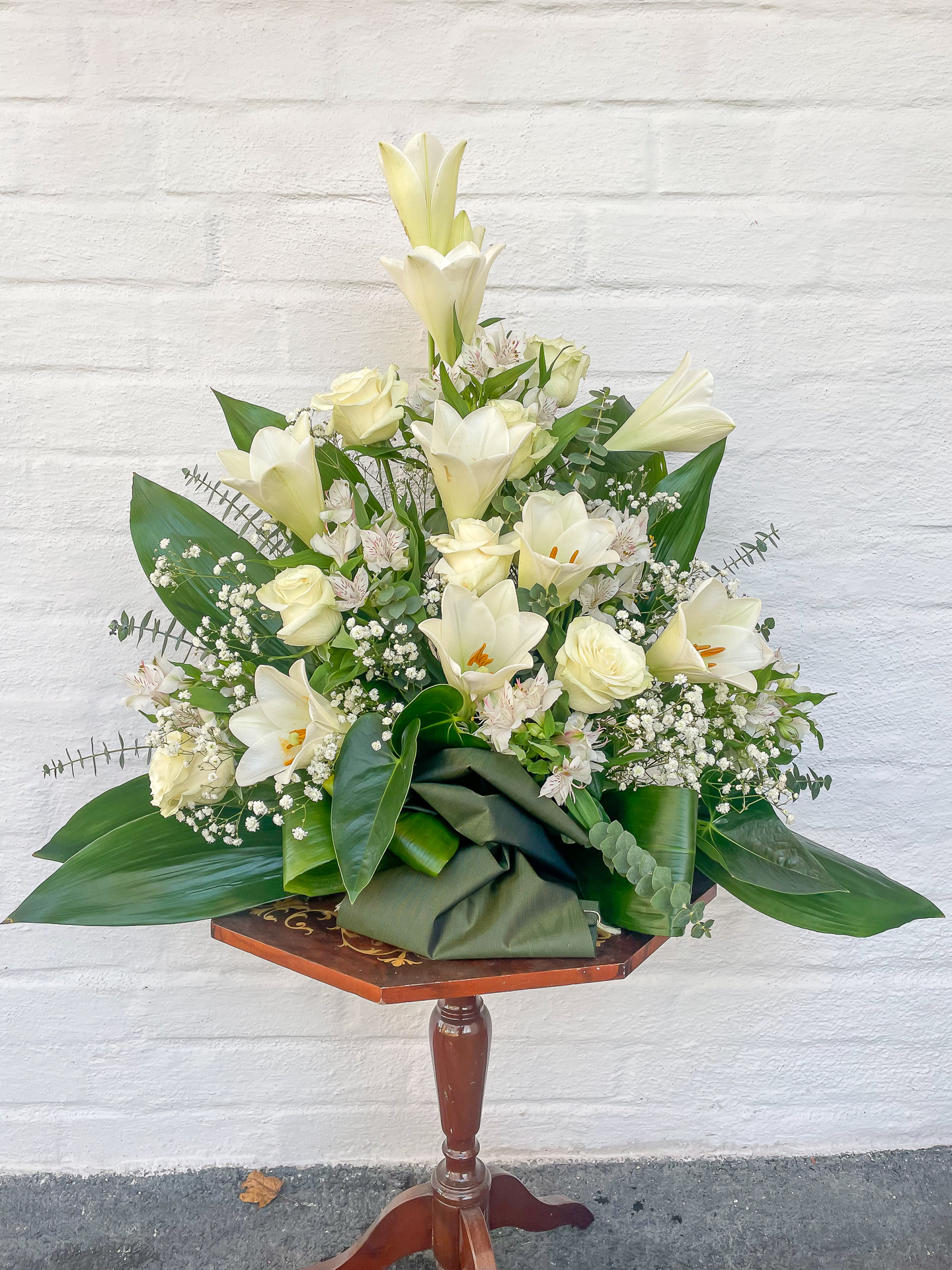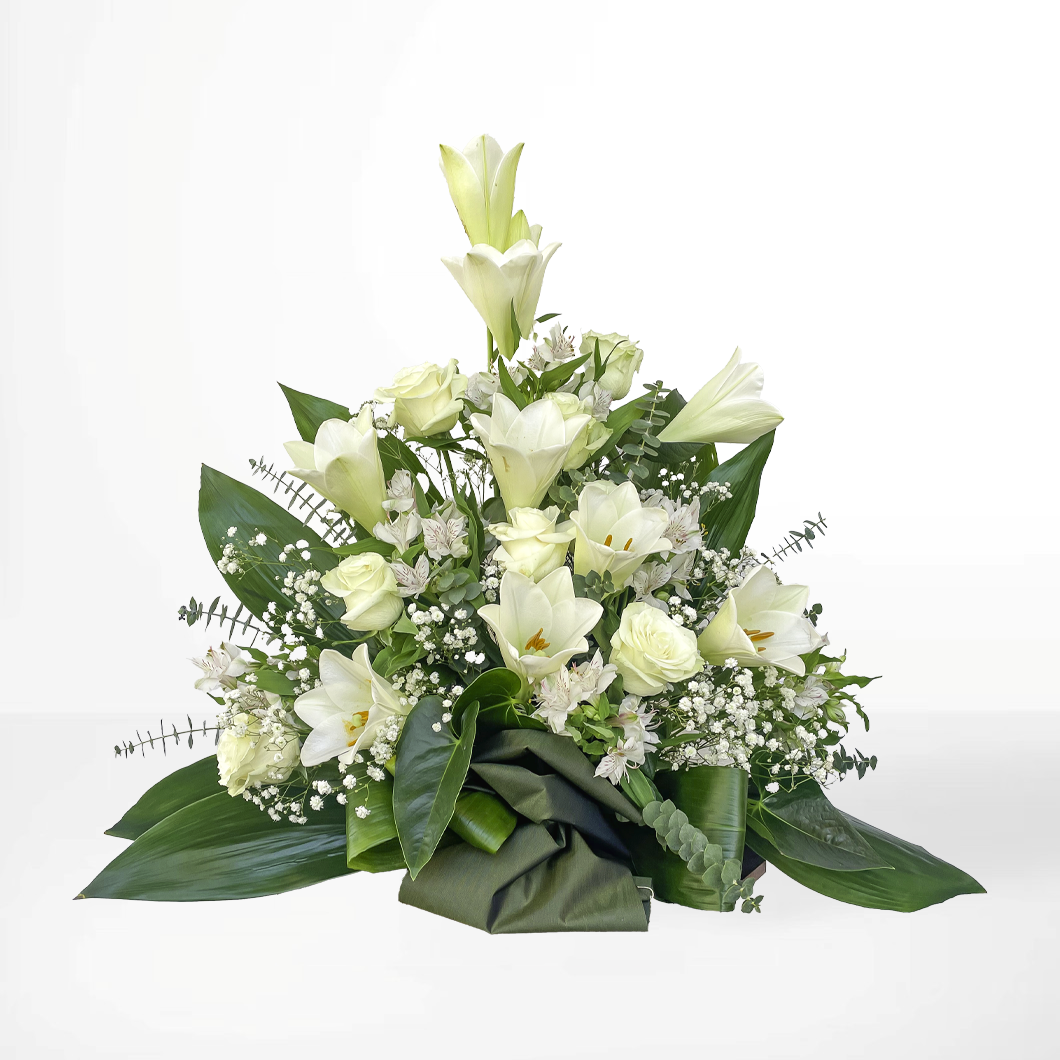En stilfull blomsterdekoration i vitt och grönt, med eleganta liljor, rosor och brudslöja. Den vita färgen står för renhet, frid och ett stilla avsked. Perfekt för en traditionell begravning eller minnesstund.