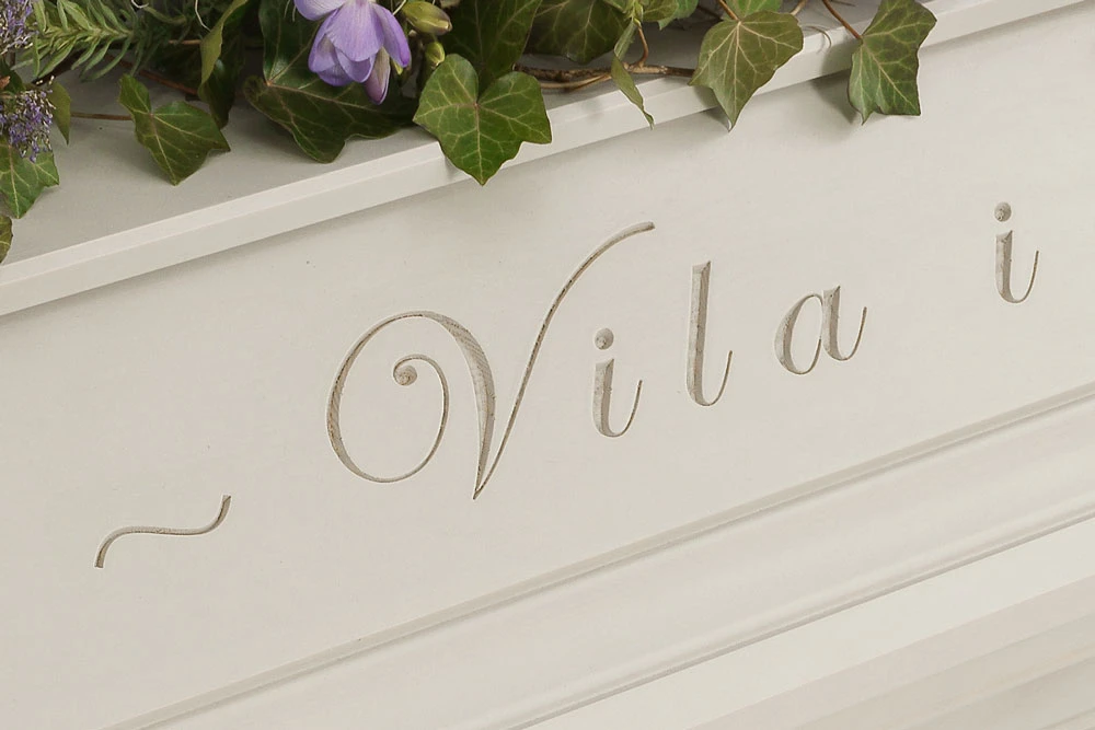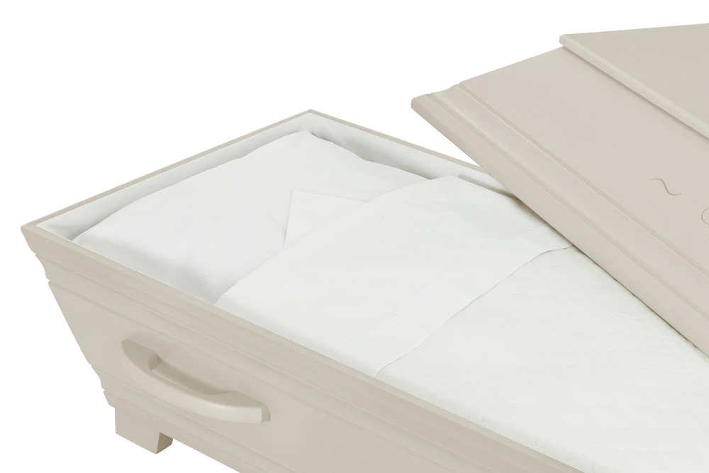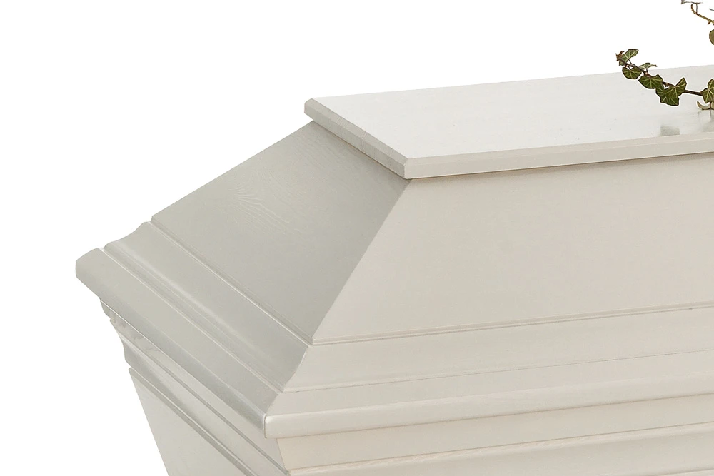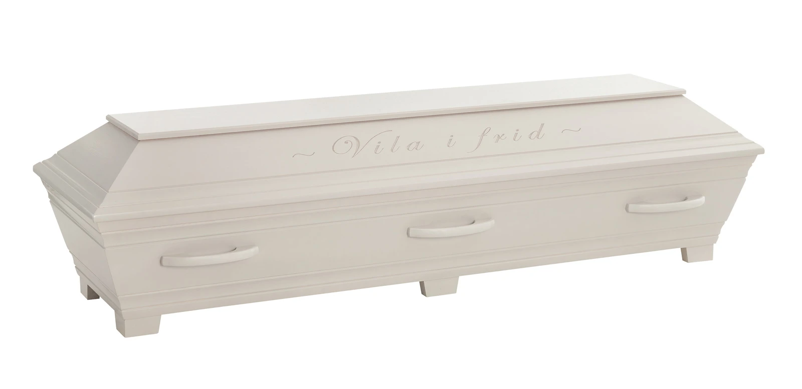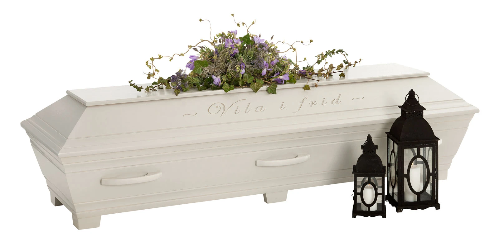 En unik och vacker kista med profileringar samt ingraverad avskedshälsning ”Vila i frid” på båda sidor av locket.
