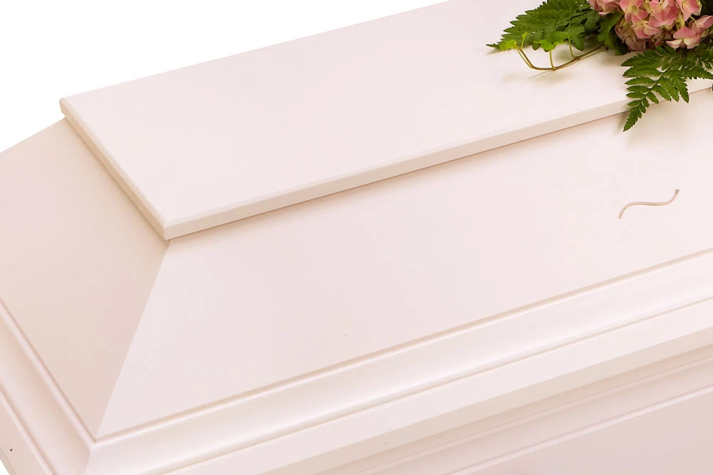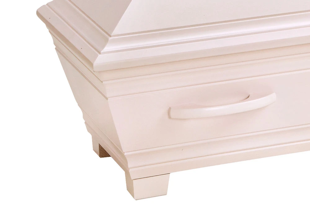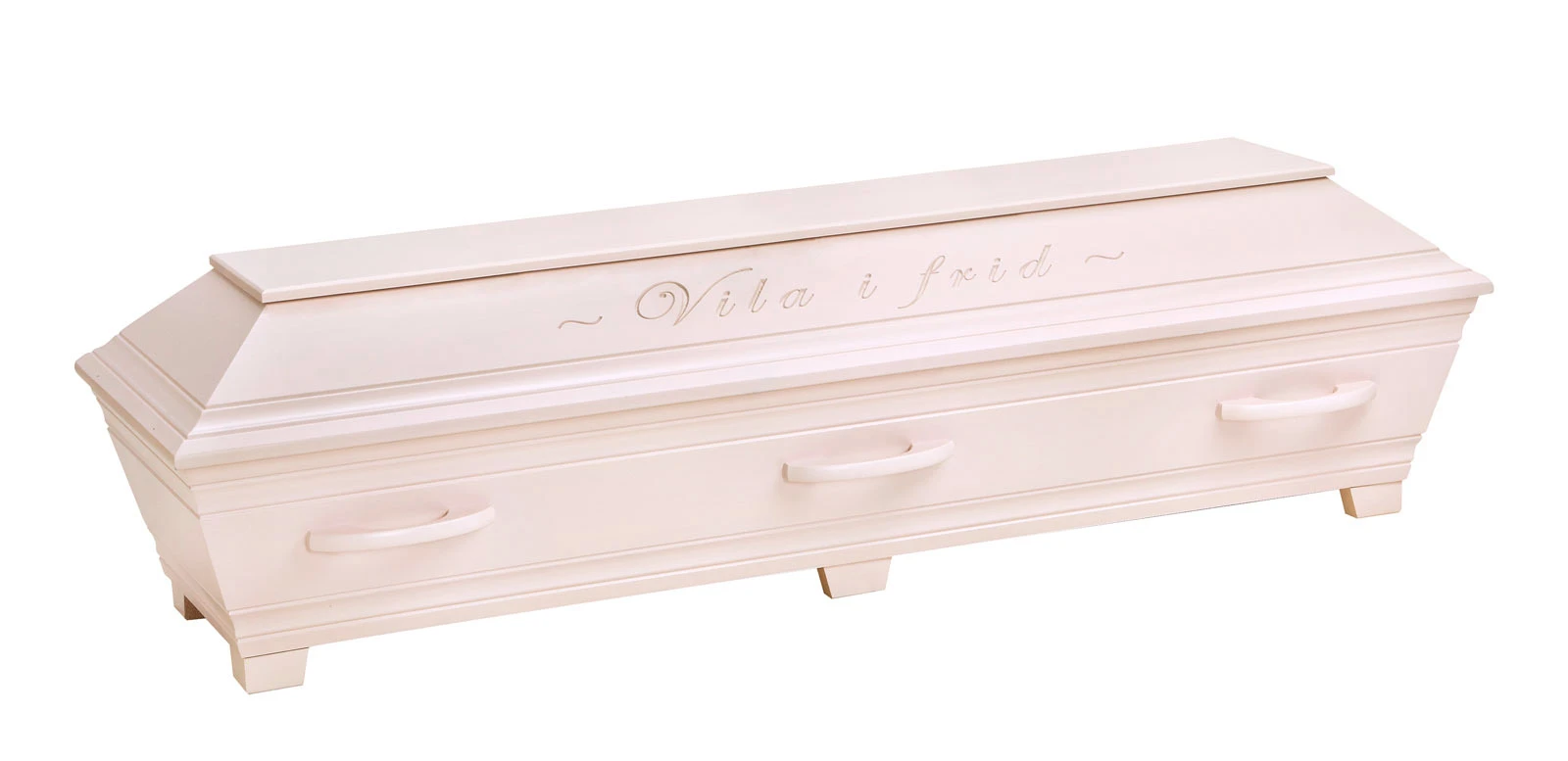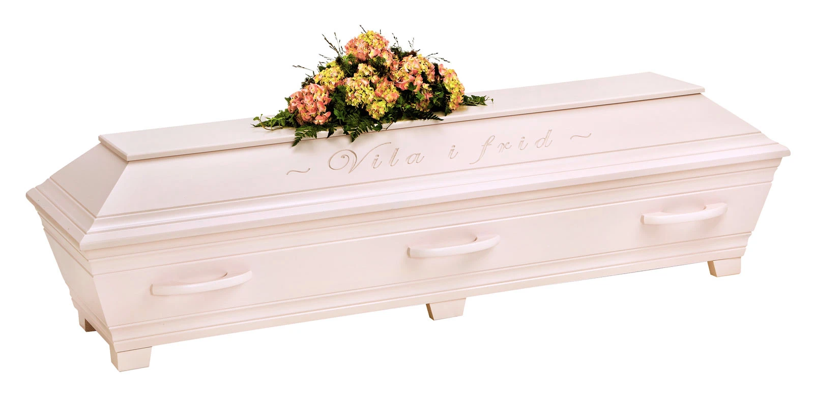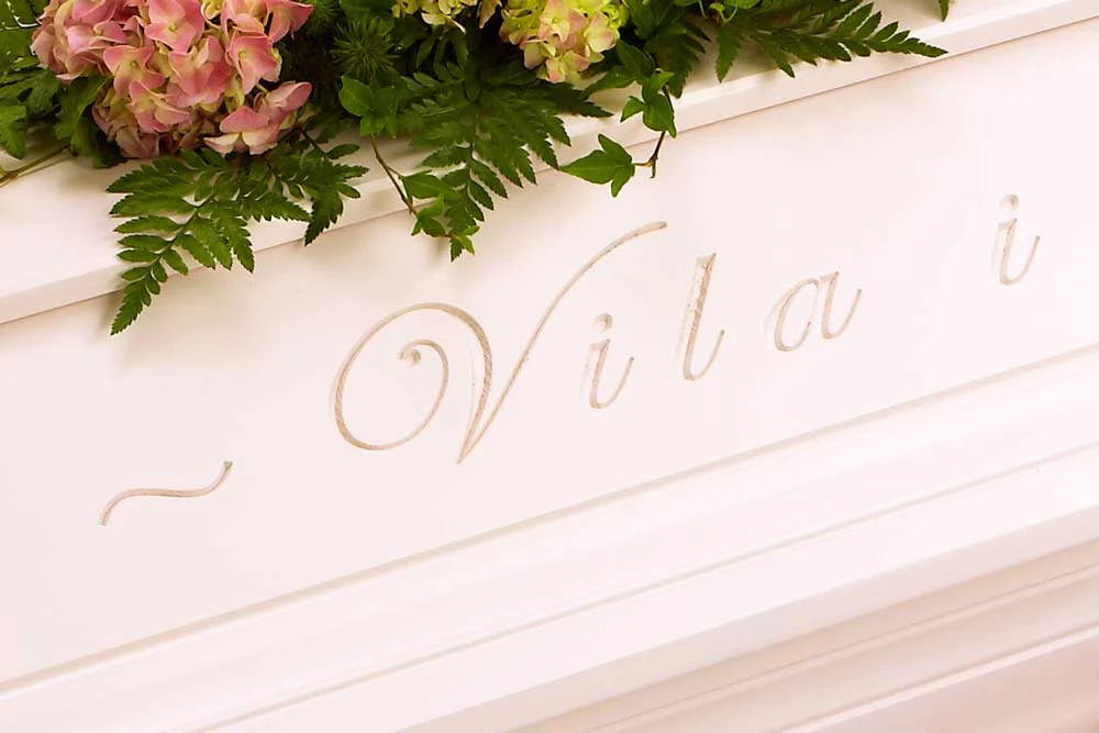 En unik och vacker kista med profileringar samt ingraverad avskedshälsning ”Vila i frid” på båda sidor av locket.