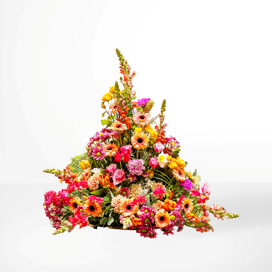 Majken är ett livfullt och uttrycksfullt stående sorgarrangemang som förmedlar både glädje och värme i avskedets stund. Arrangemanget är pyramidformat och binds med gerbera, rosor, nejlikor, lejongap och säsongens grönt i en färgpalett av rosa, orange, gult och rött. Denna komposition passar utmärkt vid både kyrkliga och borgerliga ceremonier, och kan placeras vid kista eller urna.