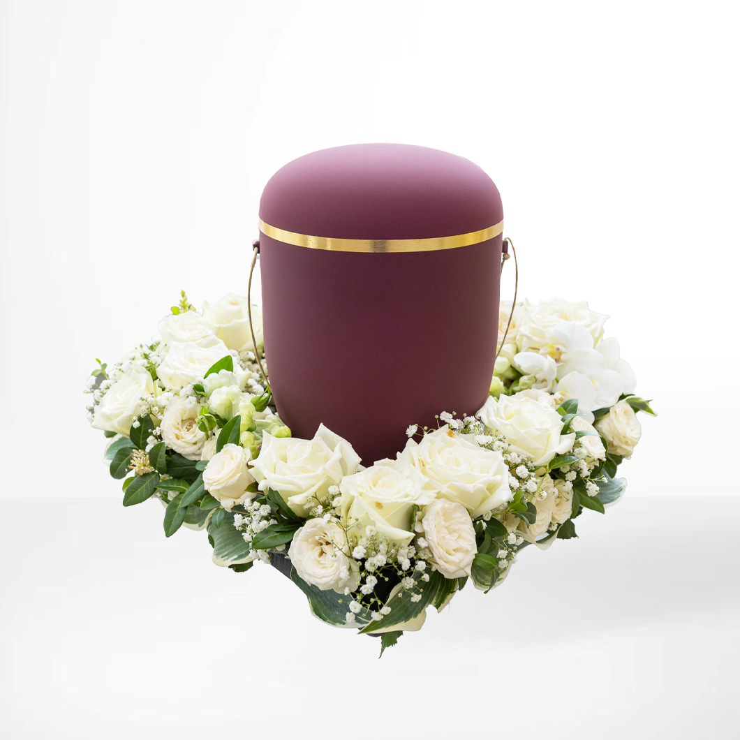 Margareta är en stilfull och harmonisk urnkrans som omsluter minnet av den avlidne med värdighet och kärlek. Den hjärtformade kransen är omsorgsfullt bunden med vita rosor, brudslöja och grönskande bladverk, vilket skapar en mjuk och fridfull inramning kring urnan.