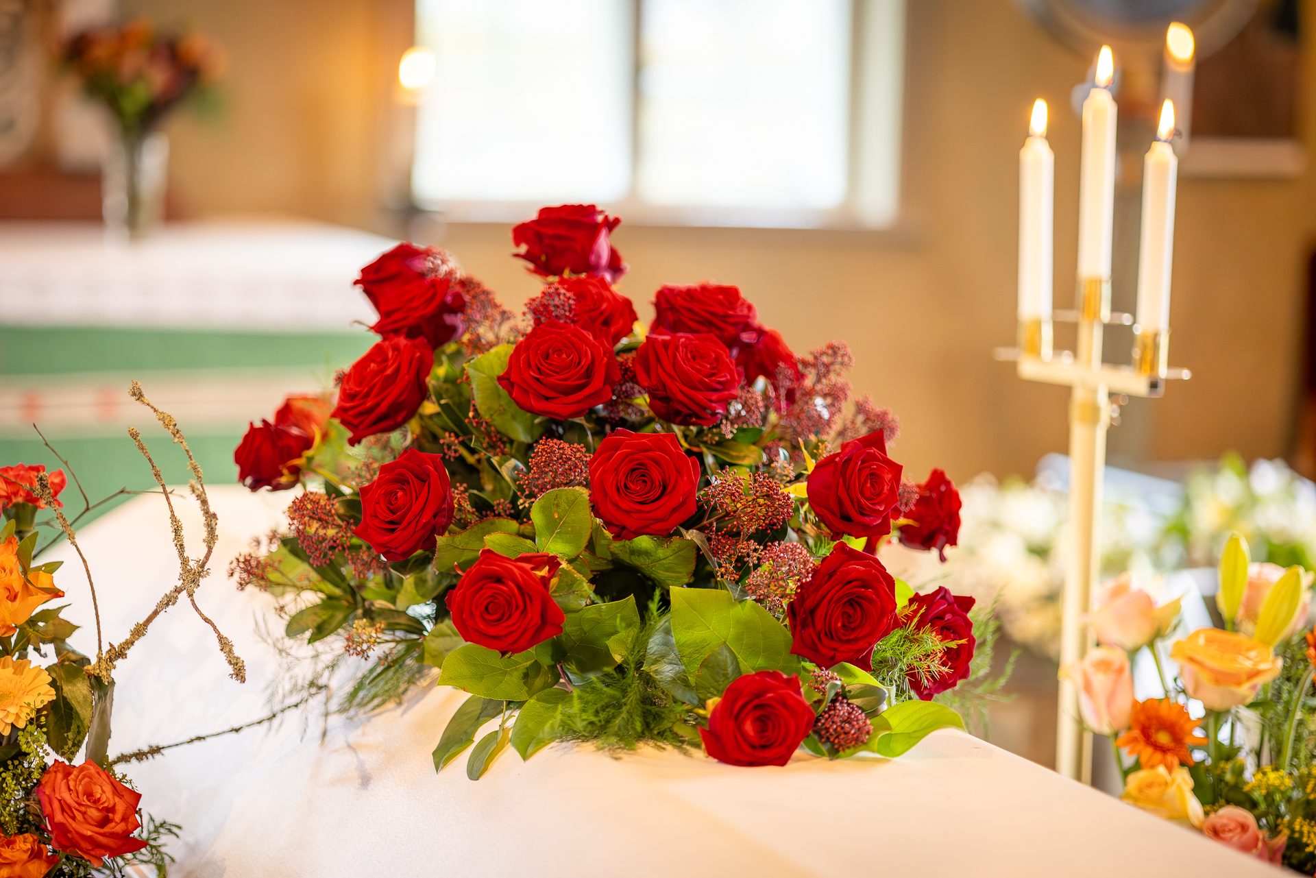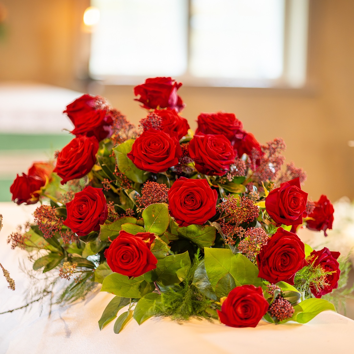 Kistdekoration med vackra röda stora rosor, röd skimmia och grönt.