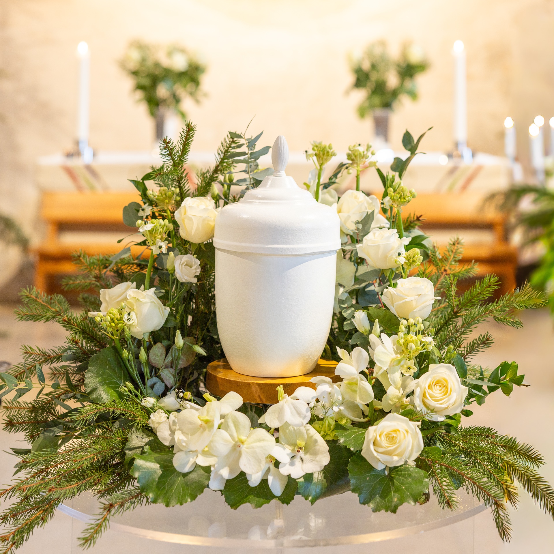 3 495 krMargareta är en stilfull och harmonisk urnkrans som omsluter minnet av den avlidne med värdighet och kärlek. Den hjärtformade kransen är omsorgsfullt bunden med vita rosor, brudslöja och grönskande bladverk, vilket skapar en mjuk och fridfull inramning kring urnan. Denna krans passar utmärkt för både kyrkliga och borgerliga ceremonier, och kan kompletteras med ett personligt…