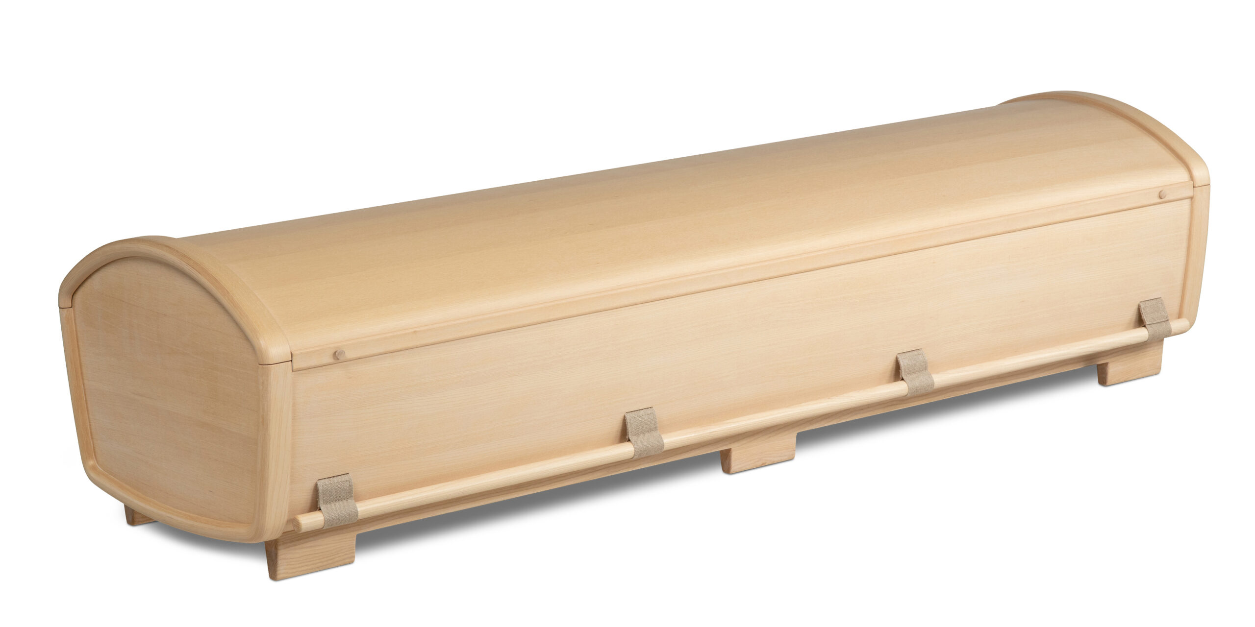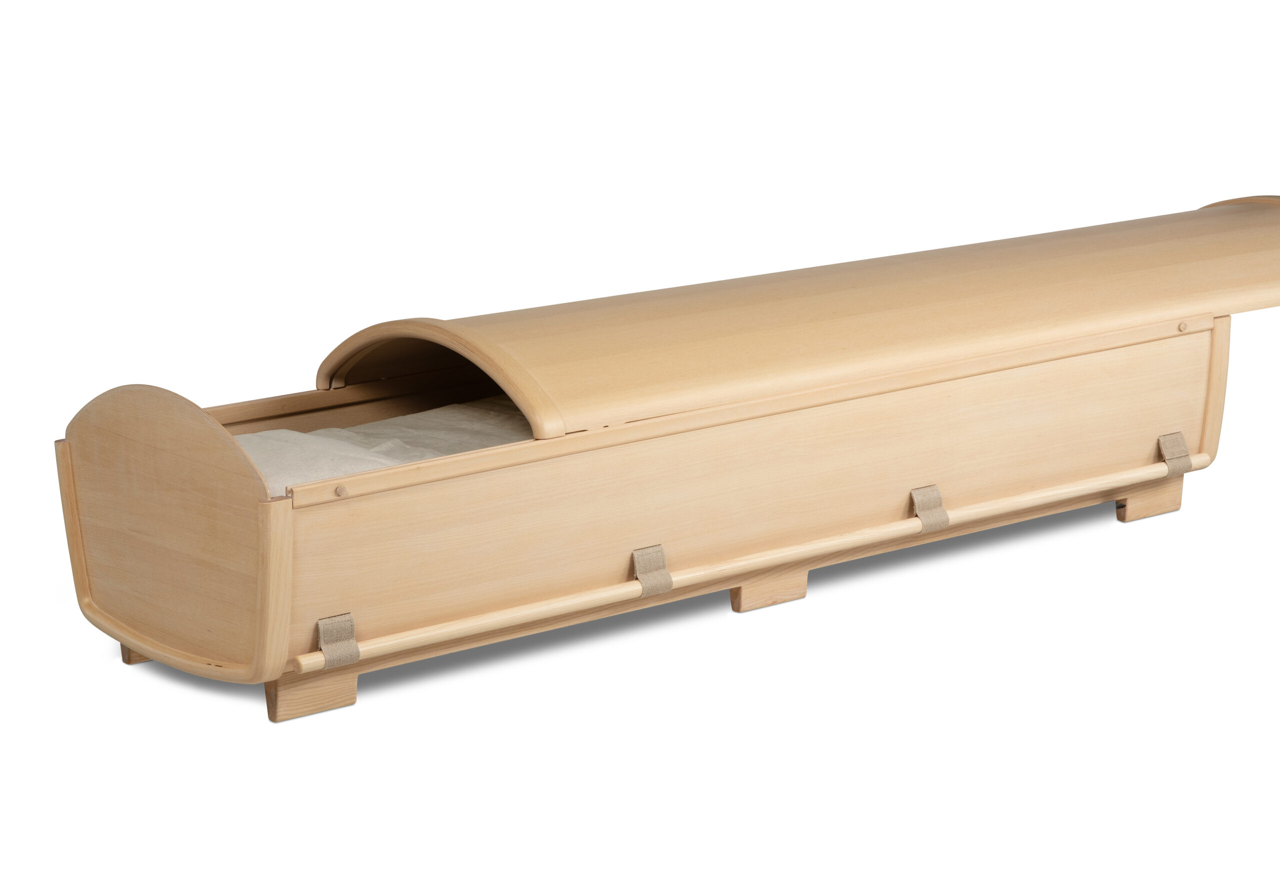 Ro är en unik begravningskista skapad av den danska möbelformgivaren Anker Bak, känd för sin minimalistiska och funktionella design. Kistan har mjuka, organiska former som ger ett harmoniskt och värdigt uttryck.