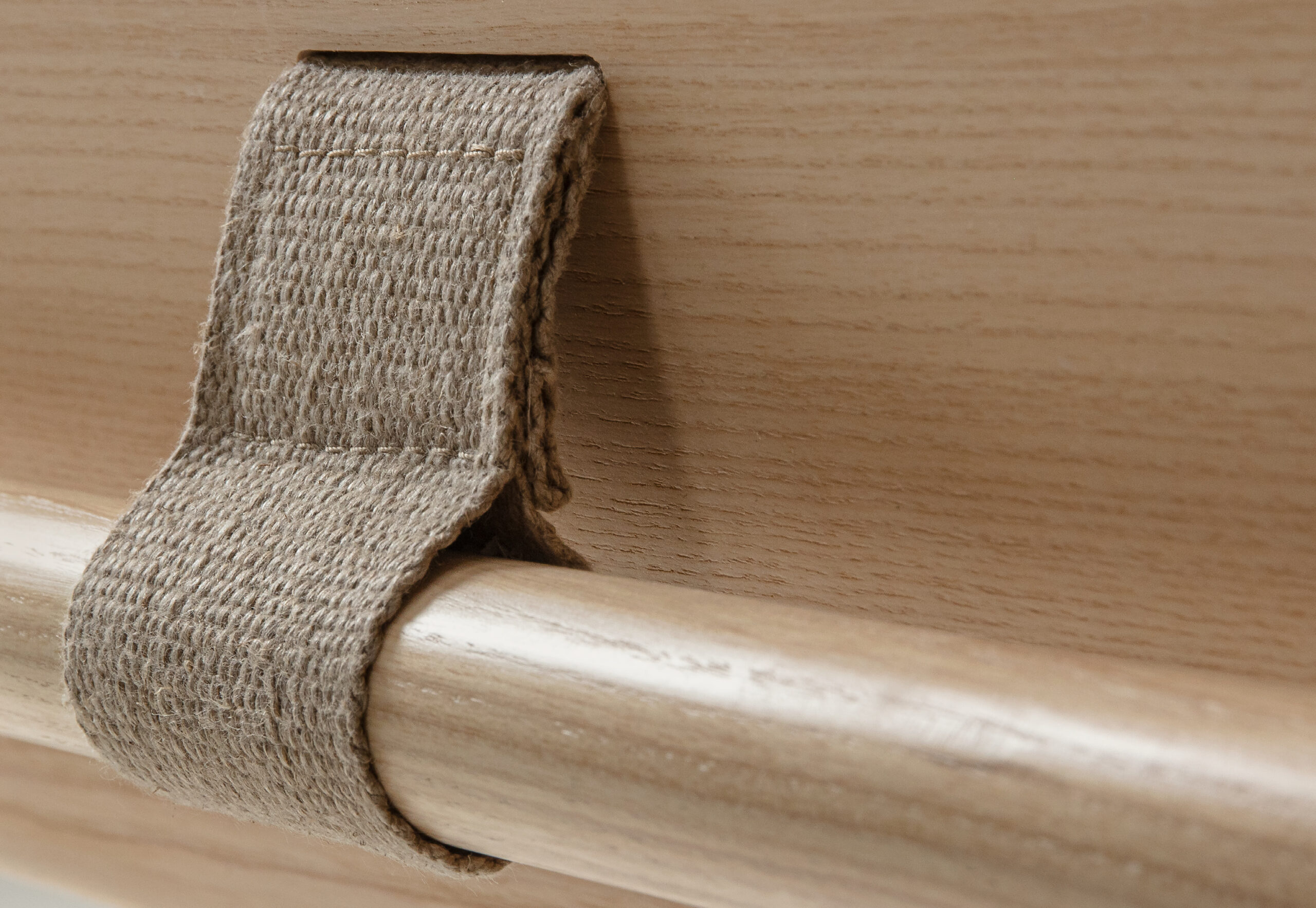 Tillverkad i oljad ask med ett skjutbart lock och en elegant tyginredning i linnekvalitet (madrass, kudde och täcke), kombinerar Ro estetik med omtanke. Den har en vacker bärstång i massiv ask med detaljer i rustik sadelgjord. Konstruktionen är helt fri från metall och använder betydligt mindre material än en standardkista, vilket gör den till ett miljömedvetet val.
