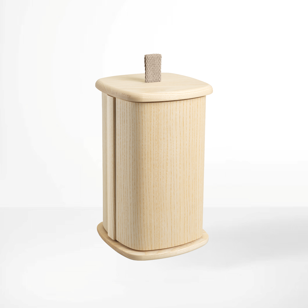Träurna formgiven av den prisbelönta danska möbeldesignern Anker Bak. Designen, inspirerad av dansk möbel­tradition, har en minimalistisk och svävande form. Urnan har ett band av återvunnen bomull och är tillverkad av formgjuten fanér med topp och botten i massivt trä. Sänkband ingår ej.