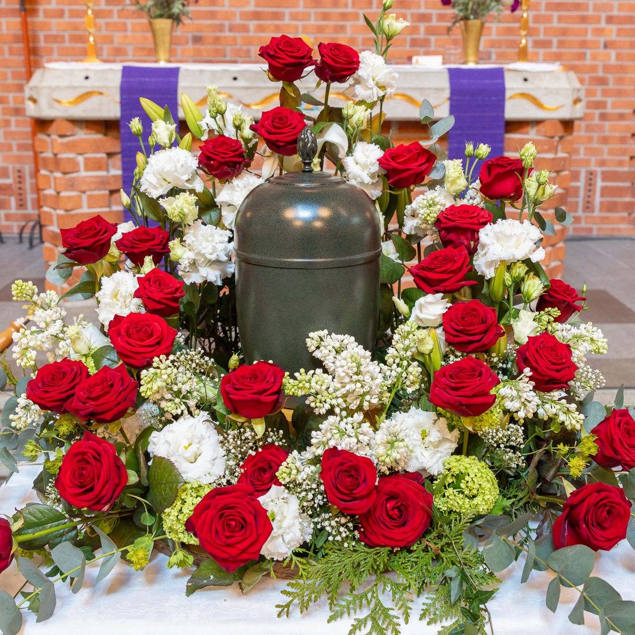 Rut är en klassisk och kraftfull urnkrans som uttrycker djup kärlek, respekt och vördnad. Den binds med röda rosor, vita nejlikor, brudslöja och grönskande bladverk, och omfamnar urnan med ett värdigt och harmoniskt uttryck. Den mörka urnan i centrum förstärker kontrasten och ger en känsla av stillhet och tyngd.