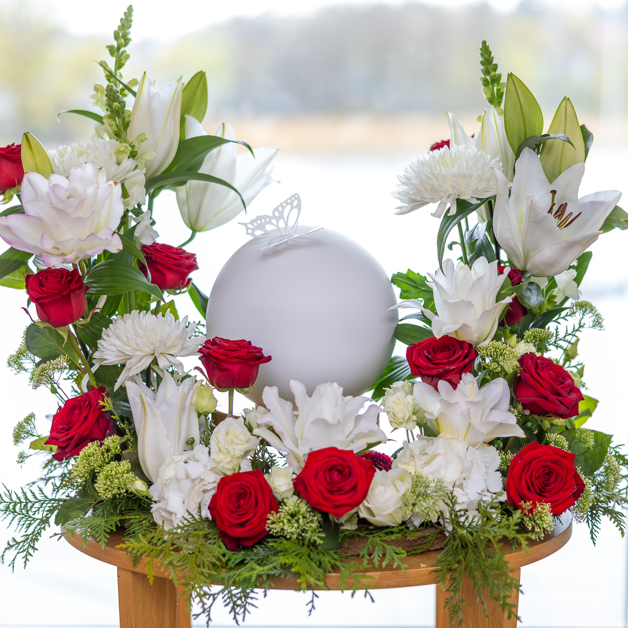 Sigrid är en modern och poetisk urnkrans som förenar tradition med elegans. Den är omsorgsfullt bunden med röda rosor, vita liljor, krysantemum och grönskande bladverk, vilket skapar en harmonisk och uttrycksfull inramning kring urnan.