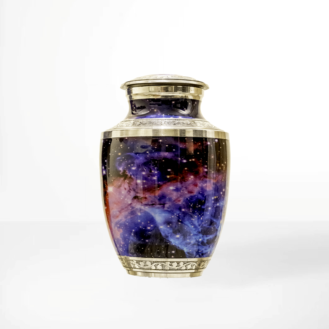 Själsrymd är en konstnärligt utformad urna som förenar det eviga med det kosmiska. Med ett motiv inspirerat av universums storslagenhet – virvlande nebulosor i blått, lila och rött, omgivna av stjärnornas ljus – erbjuder denna urna en poetisk symbol för livets oändliga resa.