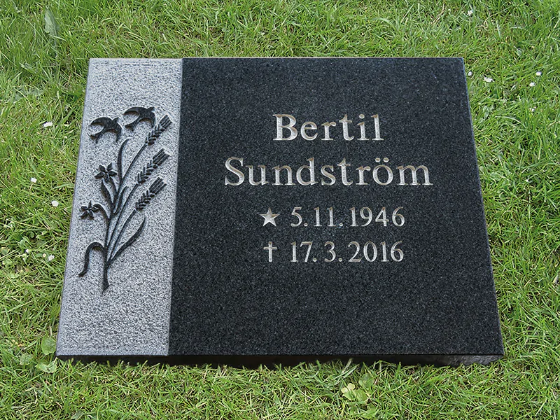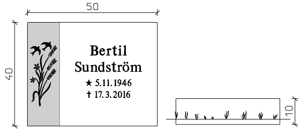 Modell E001 är en liggande gravsten med klassisk och tidlös design. Formen är rektangulär med mjukt sluttande ovansida, vilket ger ett harmoniskt och diskret uttryck. På ena sidan finns plats för en dekorativ detalj som skapar en subtil kontrast och ger stenen ett personligt inslag. Den är proportionerad för att passa väl på traditionella gravplatser och förmedlar enkelhet och värdighet.