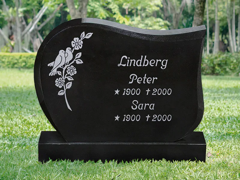 Gravsten E007 är en stående modell med mjukt vågformad ovansida och bred framtoning som ger ett harmoniskt och värdigt uttryck. Den levereras med sockel och har gott om plats för personliga inskriptioner och dekorer. Modellen kan anpassas med olika tillval och finns att beställa i flera granitsorter.