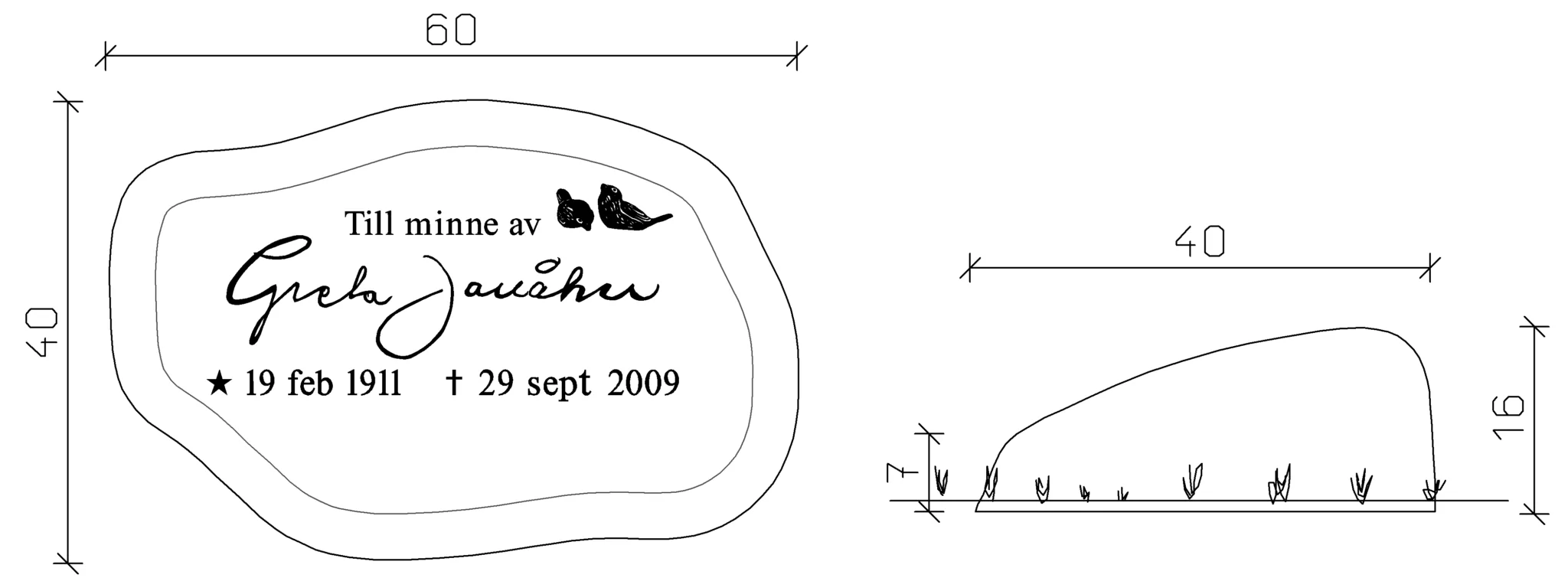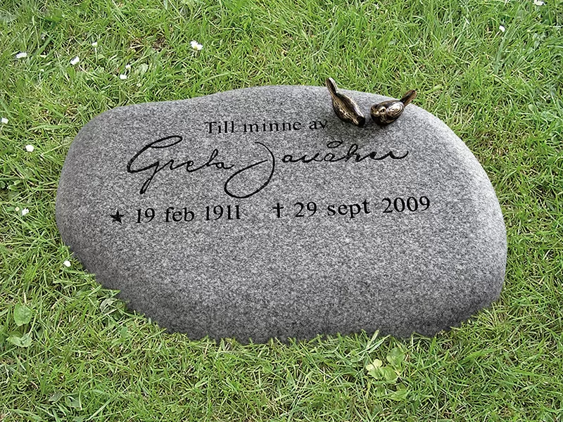 Modell E048 är en liggande gravsten med en mjukt sluttande ovansida som ger ett naturligt och harmoniskt intryck, likt en natursten. Formen är inspirerad av klassisk hällstil och skapar ett diskret men stilfullt uttryck. Den tidlösa designen gör stenen till ett värdigt minnesmärke som passar väl på traditionella gravplatser.