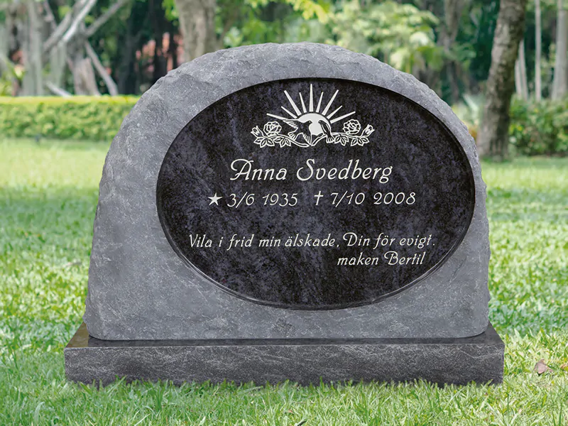 Gravsten E059 är en stående modell med naturinspirerad form som ger ett mjukt och personligt uttryck. Den levereras med sockel och har gott om plats för inskriptioner och dekorer. Modellen kan anpassas med olika tillval och finns att beställa i flera granitsorter.
