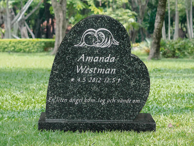 Gravsten E069 är en stående hjärtformad modell med mjuka linjer som ger ett varmt och personligt uttryck. Den levereras med sockel och erbjuder gott om plats för inskriptioner och dekorer. Modellen kan anpassas med olika tillval och finns att beställa i flera granitsorter.