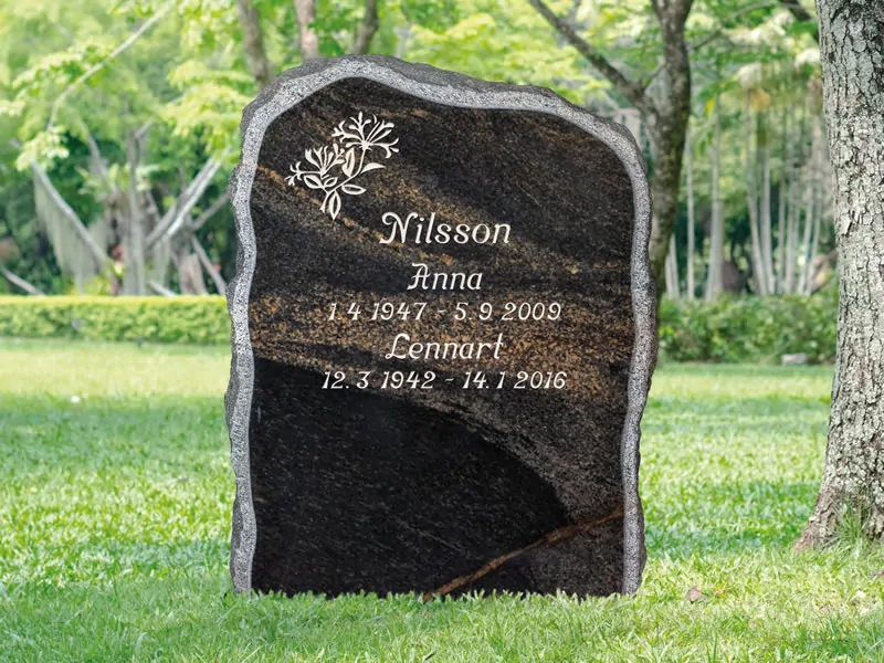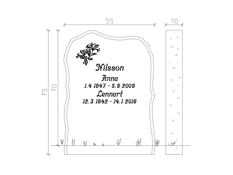 Gravsten EN015 har en stående form med oregelbunden ovansida och finhugget kantslag som ger ett naturligt och personligt uttryck. Den unika designen gör den lämplig för både traditionella och mer individuella minnesplatser. Formen är skapad för att ge ett bestående minnesmärke som förmedlar omtanke och respekt.