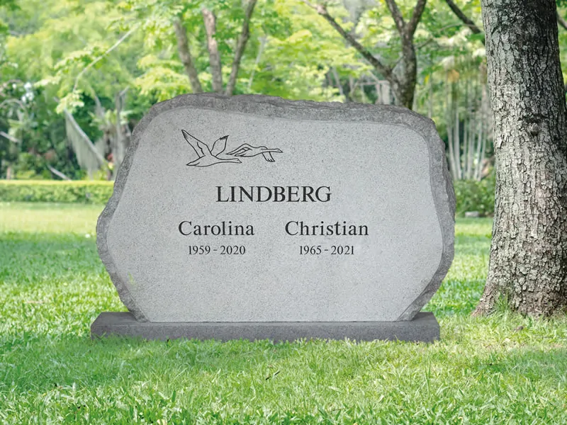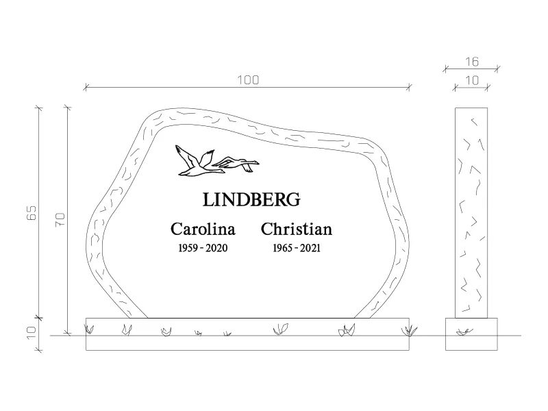 Gravsten EN085 har en stående form med asymmetrisk, mjukt böjd ovansida som ger ett modernt och harmoniskt uttryck. Den stilrena designen gör den lämplig för både klassiska och mer individuella minnesplatser. Formen är skapad för att ge ett personligt och bestående minnesmärke som förmedlar omtanke och respekt.