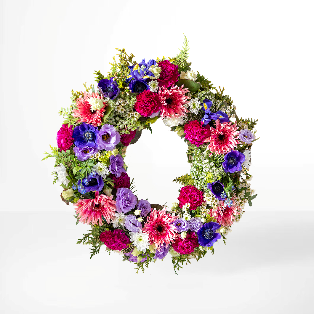 Tilda är en färgstark och harmonisk begravningskrans som förmedlar både värme och stillhet. Den är rund och symmetrisk, bunden med lila anemoner, lavendelfärgade rosor, rosa nejlikor, vita prästkragar och rosa germini, kompletterat med grönskande ormbunksblad och säsongens grönt. Denna krans passar utmärkt som ett stående arrangemang vid kistan, altaret eller minnesplatsen.